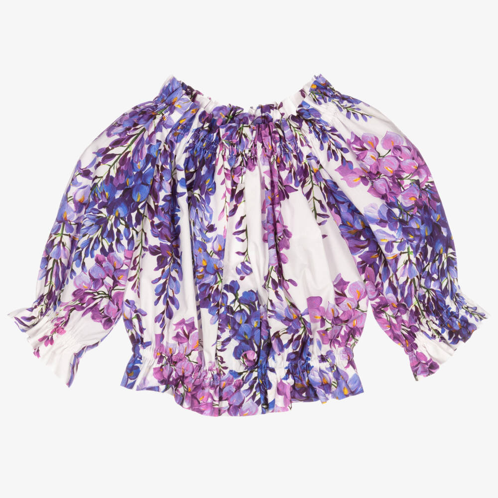 Girls white and purple cropped blouse by luxury designer Dolce & Gabbana, inspired by the delicate Wisteria pattern from the adult collection. Made in soft cotton poplin, this pretty top has puffed sleeves, and stylish ruched trims.