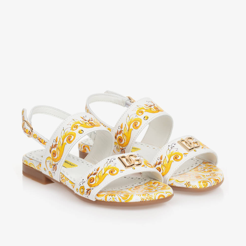 Stylish yellow and white leather sandals for girls by luxury designer Dolce & Gabbana. Beautifully crafted in Italy, they have the signature Majolica print, inspired by vibrant and ornate Sicilian tiles. There are gold-tone DG logos on the toe straps for extra designer appeal. They fasten with an adjustable buckle on the ankle strap and have a non-slip, rubber outsole.