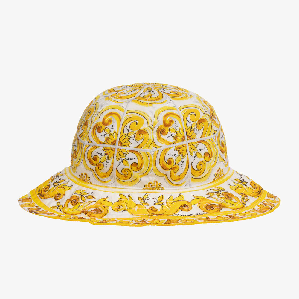 Beautiful yellow and white sun hat for girls by luxury designer Dolce & Gabbana, made in comfortable cotton poplin with a lined interior. This warm weather accessory, made in Italy, has a lightweight feel and is patterned with a vibrant, tile-inspired Majolica design. It has a wide brim with topstitched detailing and a black script logo incorporated into the print.