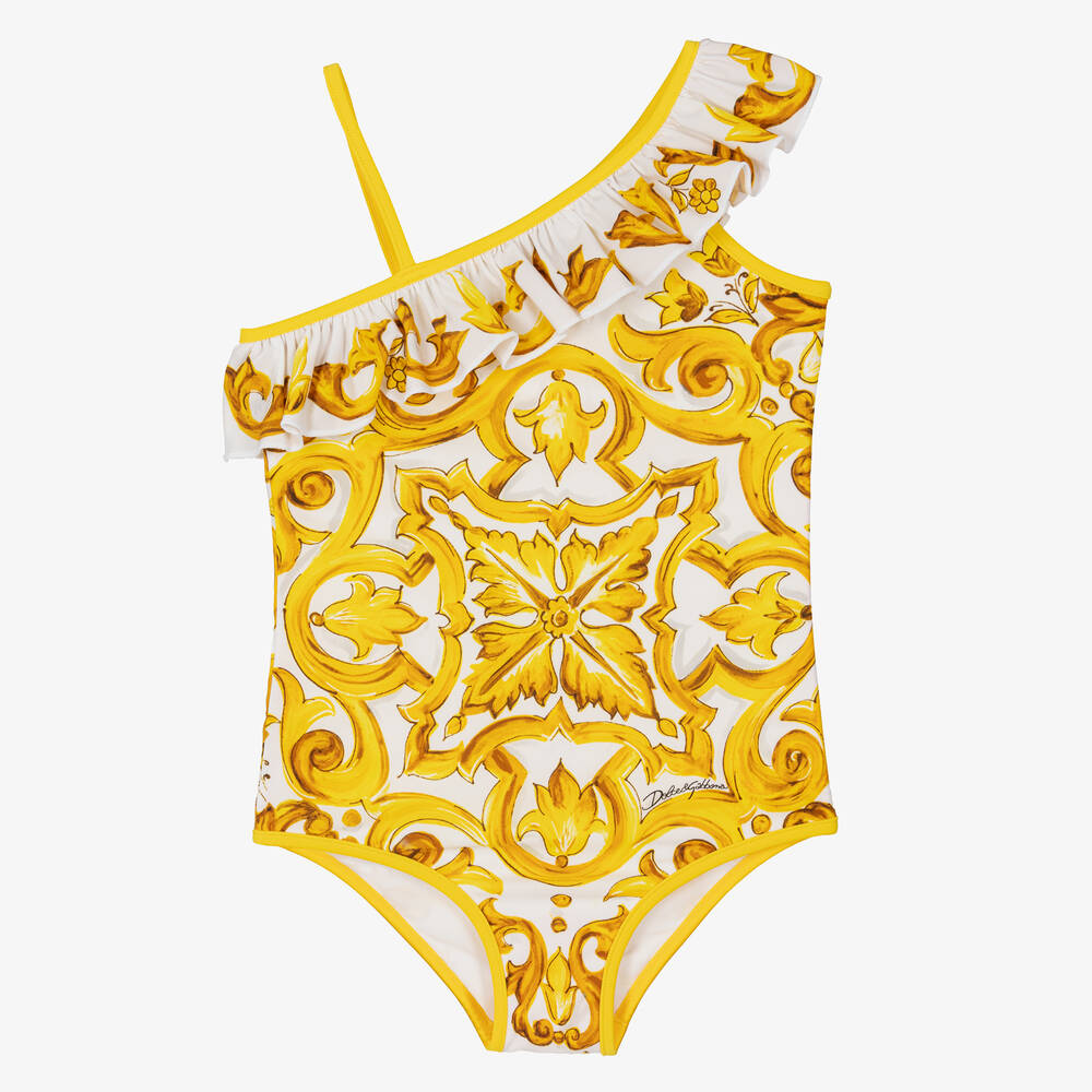 A white and yellow swimsuit for girls by luxury Italian label Dolce & Gabbana, made in a silky fabric with a comfortable stretchy lining. Lovely for resort wear, it is patterned in the signature Majolica print and is signed with a subtle black script logo for designer appeal. An elegant asymmetric design, it has a slim shoulder strap on one side and a stylish ruffle trim.