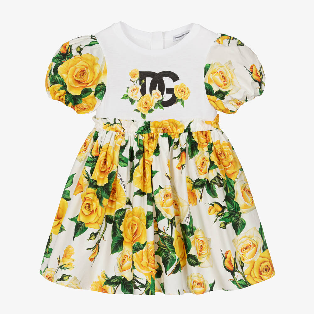 Beautiful cotton dress for girls from luxury Italian label Dolce & Gabbana, in white with an eye-catching yellow and green rose pattern. The bodice is made in soft jersey for comfort, with statement puffed sleeves and the DG logo across the chest. Gently elasticated at the waist, the dress has a voluminous poplin skirt and fastens neatly with a concealed zip on the back.