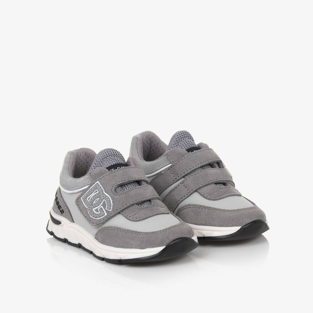 Sporty grey trainers for baby boys and girls by luxury brand Dolce & Gabbana, made in soft mesh with soft suede leather trims. For designer appeal, the easy to use velcro strap features a DG logo appliqué, with further branding on the tongue. A rubberised DG-5862 print can be seen on the side and to ensure comfort, they are lined in soft mesh with a lightly cushioned leather insole. The rubberised outer sole is ridged for improved grip.