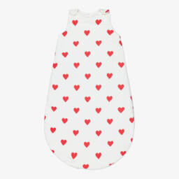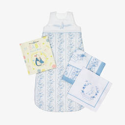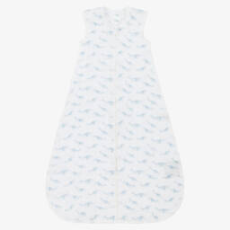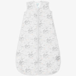 Ivory linen sleeping bag for baby boys and girls by luxury brand Dolce & Gabbana. Ideal for babies from birth, it has a neutral beige print of moons, stars and DG logos. The sleeping bag fastens with poppers on the shoulders, and zips down the side and around the foot, making night-time changes easier.