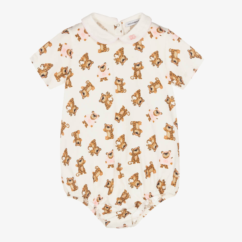 A signature ivory cotton jersey bodysuit for baby girls by Italian luxury brand Dolce & Gabbana. Gentle on delicate skin, this fun and playful piece is designed in an all-over print featuring little wild leopards wearing crossover DG logo hoodies. The rounded collar is trimmed with pale pink piping and highlighted with matching logo embroidery. There are concealed popper fastenings on the back and between the legs to help with changing.