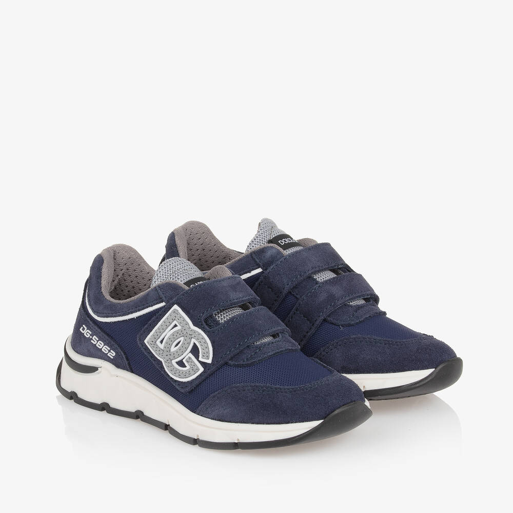 Cool and sporty navy blue mesh trainers for boys and girls by luxury brand Dolce & Gabbana, trimmed with soft suede leather. Accented with grey, these low-top sneakers feature a light-reflective DG logo appliqué on the velcro strap, a rubberised DG-5862 print on the side, and a branded label on the tongue. Comfortable to wear, they have a lightly padded leather insole, breathable mesh lining and a dual-tone rubber sole, ridged for better grip.