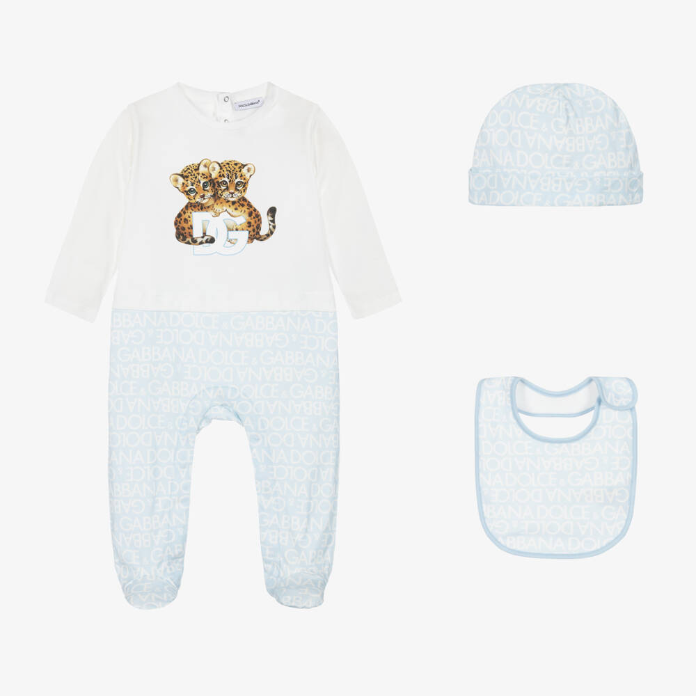 An adorable pale blue and ivory babysuit set for boys and girls by luxury brand Dolce & Gabbana. Made from soft cotton jersey, all three pieces have a distinct branded pattern. The babygrow has a striking leopard cub design featuring their signature crossover DG logo printed on the chest, for an iconic designer look. There are popper fastenings on the back and between the legs for easy dressing. Presented in a lovely gift box, the set includes a coordinating bib and hat.
