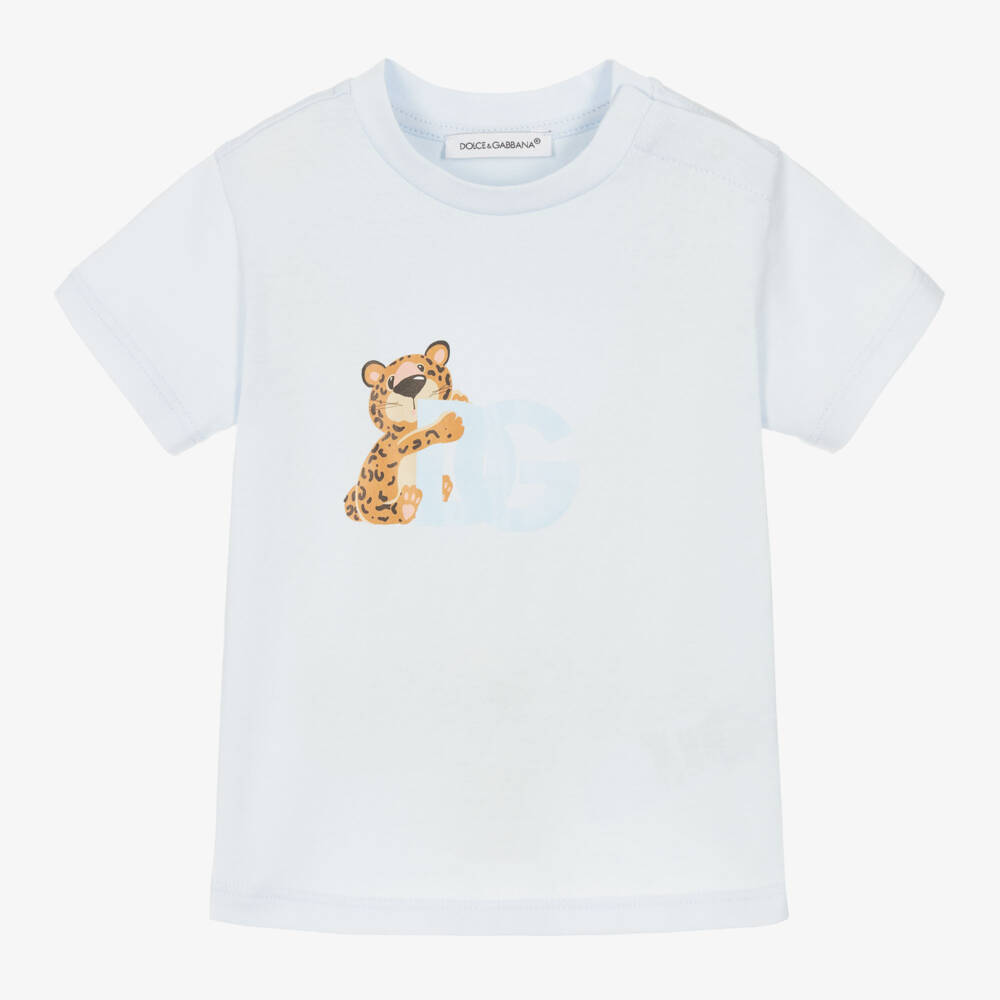 Pale blue T-shirt for little boys by luxury Italian brand Dolce & Gabbna, made in soft and stretchy cotton jersey. It has a cute baby leopard printed on the front hugging a tonal blue Crossover DG logo. Comfortable to wear, it has a classic ribbed crew neck and popper fastenings on one shoulder for easy dressing.