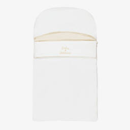 Pale pink and white, lightly padded nest for baby girls by luxury brand Dolce & Gabbana, with the crossover DG logo pattern. For a seamless look and easy access, there is a concealed, side zip fastening that extends to the base. There are grosgrain ties on the sides for an adjustable length and branded button fastenings hood so it can be laid flat. It is made and lined in soft cotton jersey for ultimate comfort.