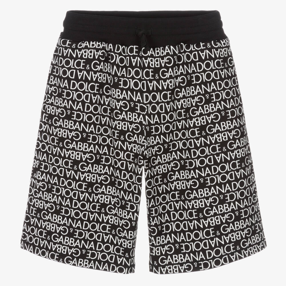 Distinctive black shorts for teen boys by luxury label Dolce & Gabbana, patterned with bold white logo prints. Great for laidback looks, these casual shorts have an adjustable drawstring waist and side seam pockets for carrying essentials. They are made in soft, mid-weight cotton jersey for easy wear.