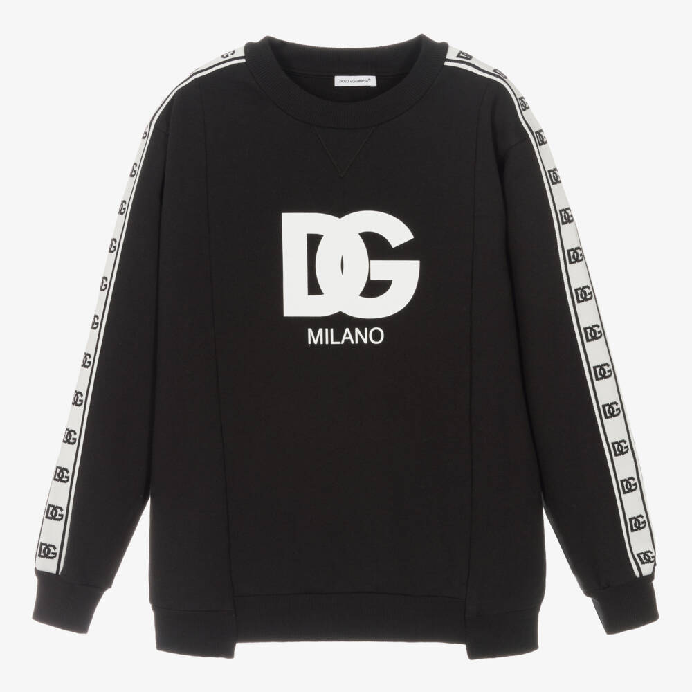 Cool and casual for teen boys, this black cotton jersey sweatshirt is by luxury Italian fashion house Dolce & Gabbana. For instant brand recognition, it is printed with a bold white crossover DG logo on the front, with black and white logo tape down the sleeves.