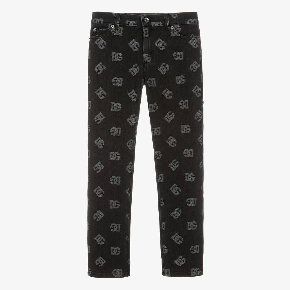 Black DG monogram jeans for teen boys by luxury brand Dolce & Gabbana, taking inspiration from the adult collection. This five-pocket style stands out with the distinctive logo pattern in a textured grey jacquard pattern. The logo-branded gunmetal silver tone studs and plate add an extra designer finishing touch. They are made from soft cotton denim with comfortable stretch and fasten with a zip and branded button on the front.