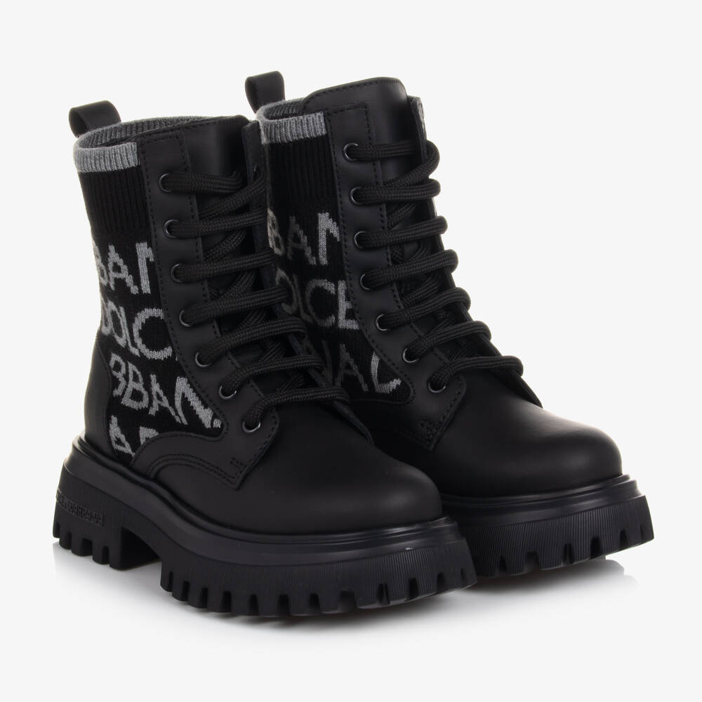Black leather boots for teen boys by luxury Italian label Dolce & Gabbana, trimmed with a grey knitted logo design. Sleek and modern, these lace-up shoes have a logo embossed on the side of the chunky rubber outsole for a designer finish.