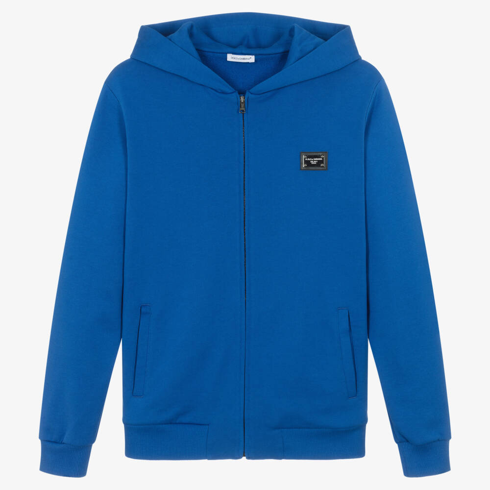As seen in the main collection, this royal blue zip-up hoodie for teen boys is by luxury Italian brand Dolce & Gabbana. For designer appeal, it has a metal logo plate on the chest and fastens with a branded zip on the front. Great for relaxed days, this casual top is made in soft mid-weight cotton jersey, has ribbed knit trims, pockets on the front and a lined hood for comfort.
