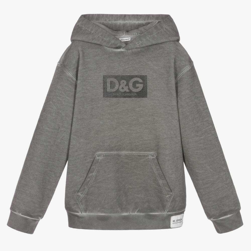 From luxury Italian brand Dolce & Gabbana and inspired by the main collection, a washed grey hoodie for teen boys in the designer's 1996 style. This casual hoodie has a black D&G logo on the front for instant recognition and is finished with a white re-edition badge near the hem to solidify the 90s style. Made in soft mid-weight cotton jersey, this cool top is comfortable and easy-to-wear.