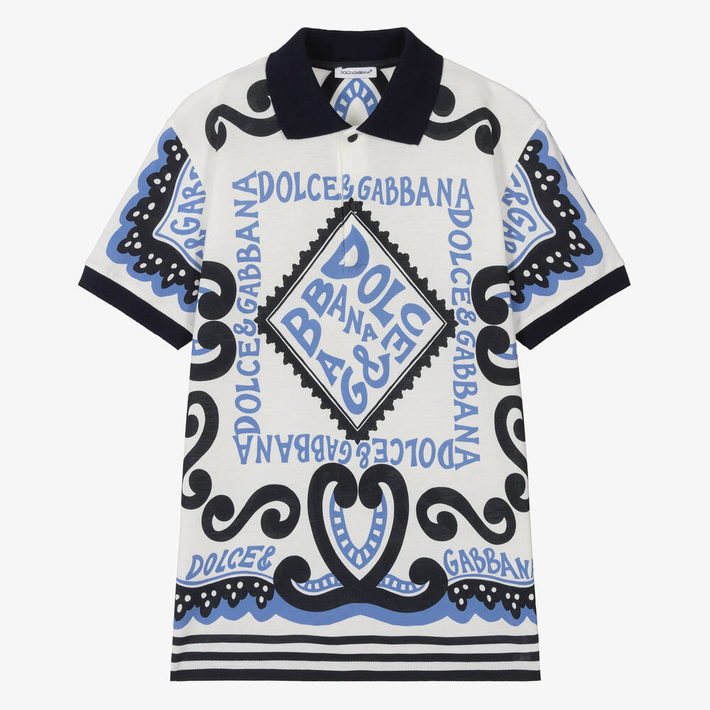 A white and blue cotton polo shirt for teen boys by esteemed luxury designer Dolce & Gabbana, with stand-out logo graphics. Stripes, bandanna prints and the four cardinal points decorate the fabric; cool oceanic-themed artwork that celebrates the sailing profession. Made in soft, stretchy piqué, this short-sleeved polo shirt has a pointed collar and front button closures for that classic look.