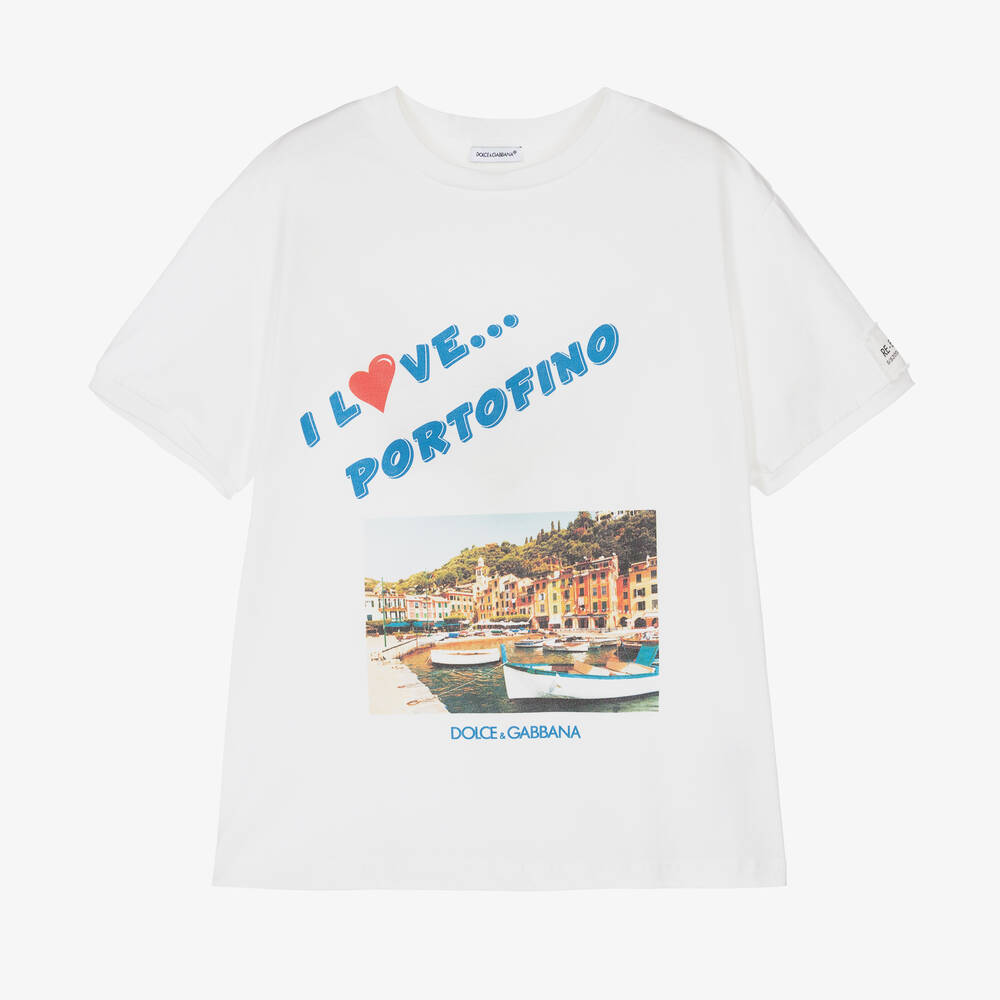 A white cotton T-shirt for teen boys from luxury brand Dolce & Gabbana, as seen in the main collection. Renowned for their vibrant graphics, the designer celebrates the brightly coloured homes of the Italian coastal village of Portofino, with an ironic '00s-style postcard and retro lettering above. Drawing inspiration from archival pieces, the top has a Re-Edition canvas patch stitched on the sleeve, paying homage to the Spring/Summer 2006 collection.