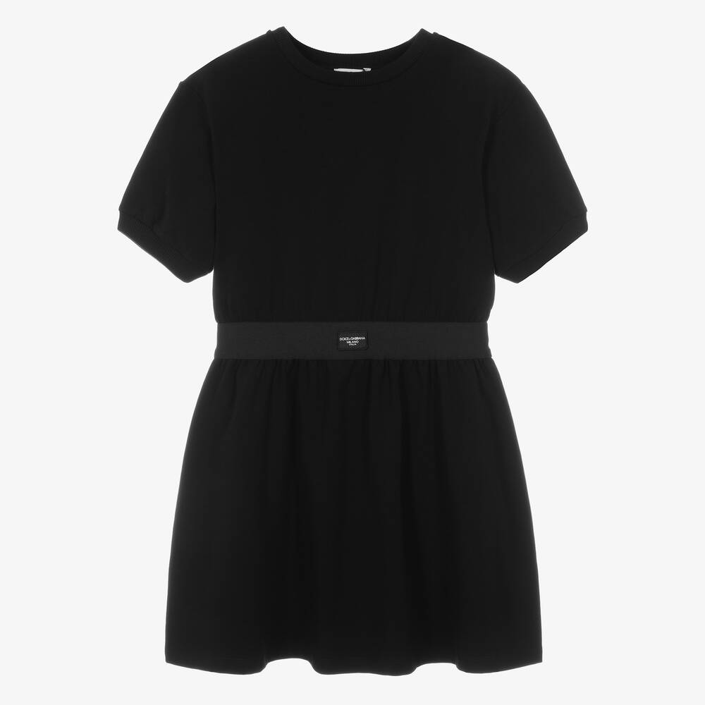 A black skater-style dress for teen girls by luxury Italian brand Dolce & Gabbana. Effortlessly stylish for everyday casual, it has an elasticated waistband with a signature logo badge on the front. It is made from soft cotton jersey with ribbed trims on the crew neck and puff short sleeves.