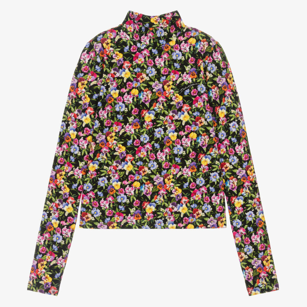 Patterned in a gorgeous pansy print in pink, yellow and purple, this black cotton jersey turtle neck top for teen girls is by luxury Italian fashion house Dolce & Gabbana. The vibrant and colourful floral print discreetly incorporates the designer's name, adding subtle touch of branding.