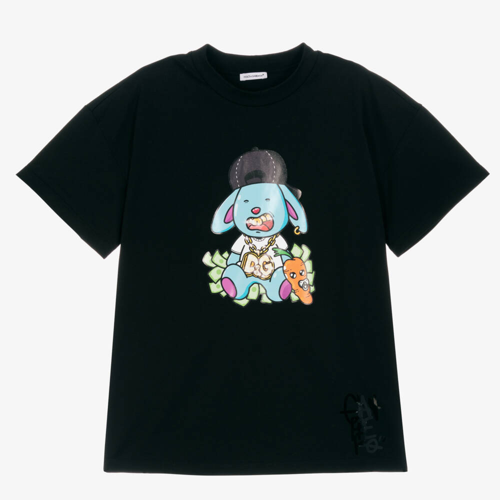As seen in the main collection, this black T-shirt for teen girls is by Italian luxury brand Dolce & Gabbana. It is packed with playful personality, featuring a cartoon-style bunny logo print on the front, illustrated by artist Gianpiero. His tag logo can also be found as a black print just above the hem.