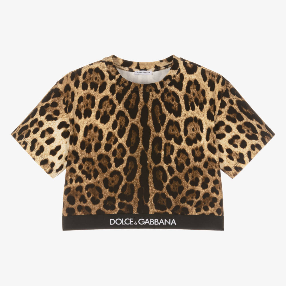 A beige and black T-shirt for teen girls from luxury brand Dolce & Gabbana, inspired by the womenswear collection. Instantly recognisable, this cotton jersey tee is patterned in the signature leopard print design, offering elegance to this sporty style. A logo jacquard tape hem gives structure to it's cropped fit.