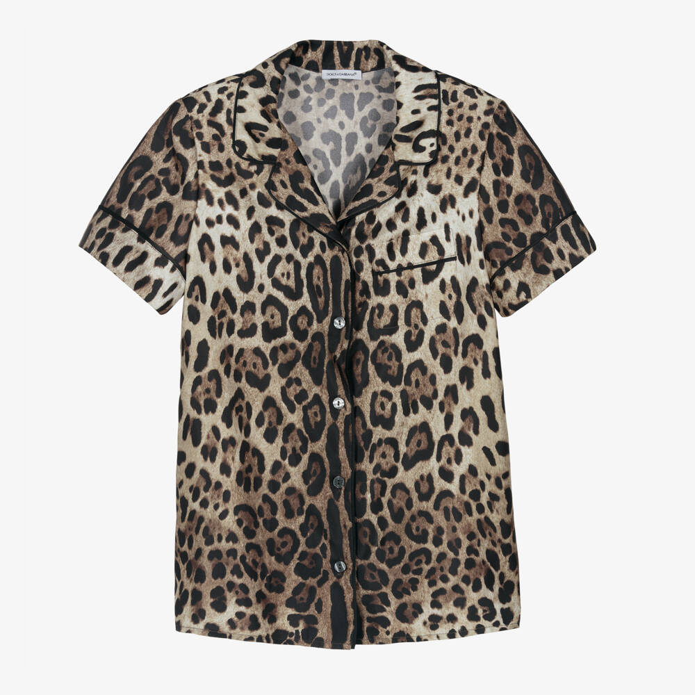 A stand-out shirt for teen girls by Dolce & Gabbana, in the designer's signature brown, black and beige leopard print. A true luxury statement, it is crafted from soft and flowy silk twill with a revere collar, contrasting black piping trims and a chest pocket. The logo branded pearlescent black button fastening add a subtle designer element to this smart casual piece.