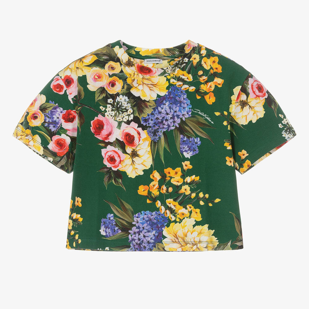 A stylish refresh to your teen girls wardrobe, a green jersey T-shirt from Dolce & Gabbana. Featuring the luxury designer's signature logo, this short-sleeved tee is patterned in a vibrant floral print for a fresh, feminine look. It is styled in a laid-back boxy fit and is made from soft cotton.
