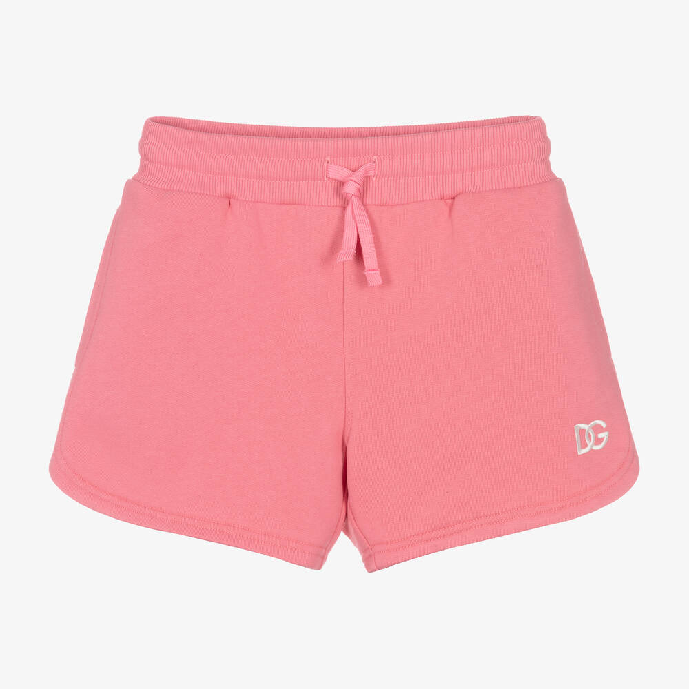 Casual pink shorts for teen girls by luxury Italian label Dolce & Gabbana, embroidered on the leg with a white crossover DG logo. With their runner-inspired design, these cotton shorts are made in mid-weight jersey, ideal for laid-back days. They have a stretchy, ribbed waistband, easy drawstring ties and two side pockets which are hidden on the seam. Curved hems create a sporty silhouette.