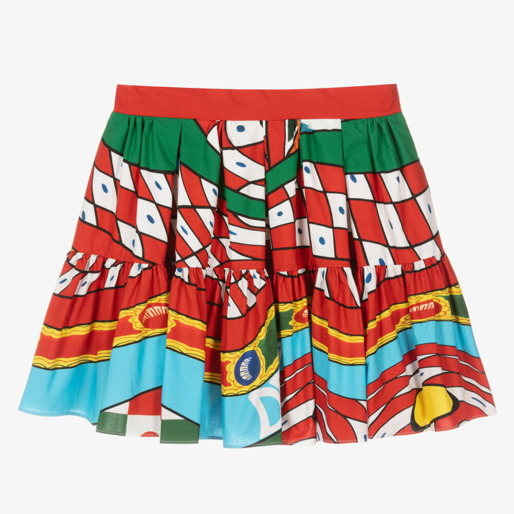 A red, blue, green and yellow mini skirt for teen girls by luxury designer Dolce & Gabbana, made in soft, smooth cotton poplin. A vibrant design the Italian label is renowned for, this statement piece is richly decorated with the iconic Carretto pattern, with retro logo lettering amongst the print. Partially lined with cotton for comfort, the hem is ruffled and there is a gold-tone zip fastening on the back.