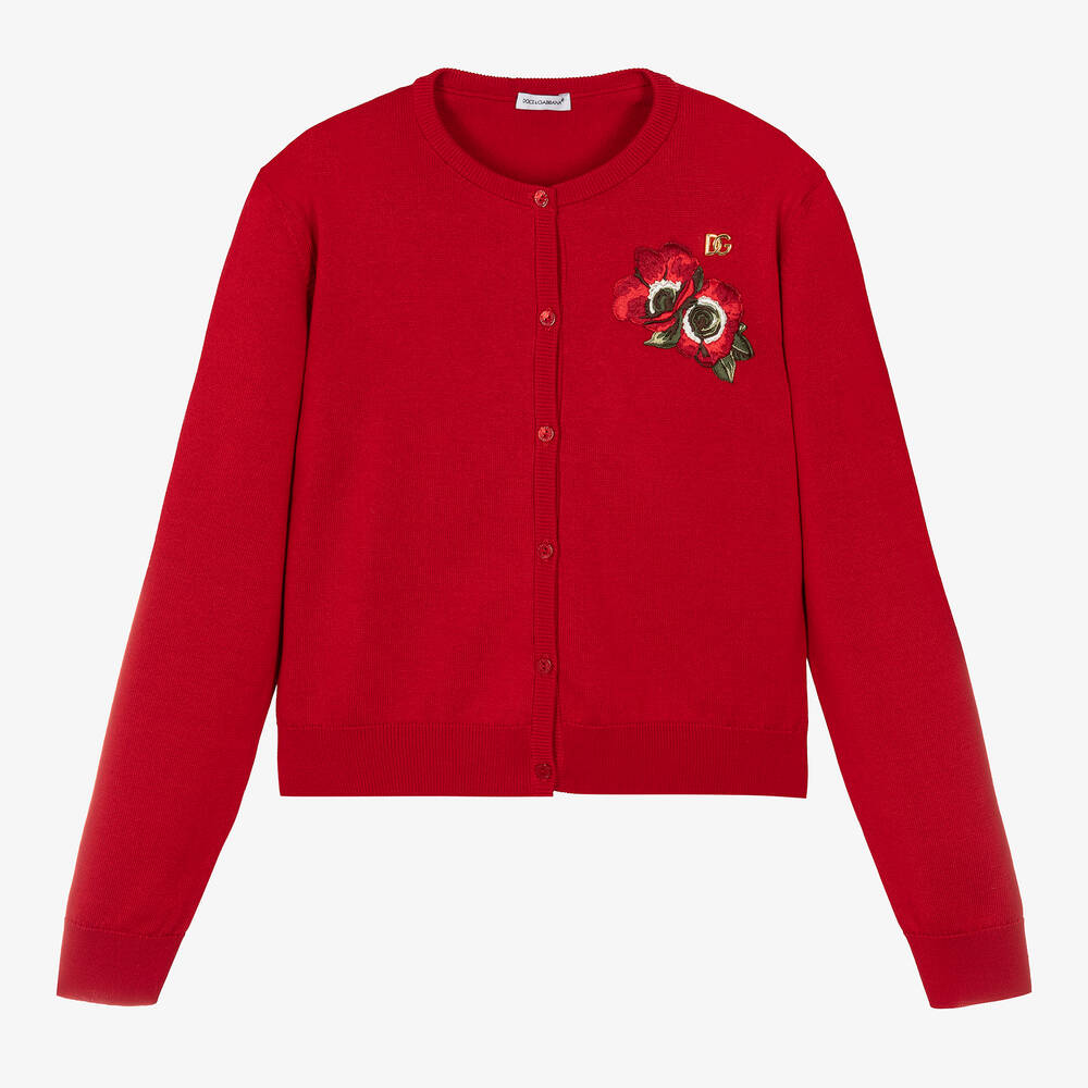 From Italian fashion house Dolce & Gabbana, a lovely red cardigan for teen girls featuring the luxury brand's golden crossover DG logo charm. In a classic style with long sleeves and branded button fastenings, this lovely piece is finely knitted in soft cotton. A beautiful floral appliqué on the front adds an elegant finishing touch to this timeless piece.