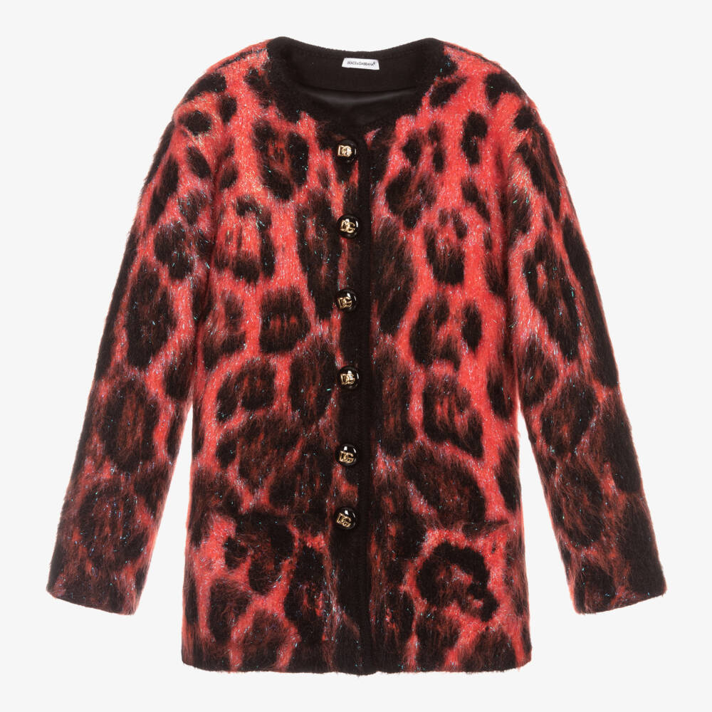 As seen in the main collection, statement red and black reimagined leopard print cardigan for teen girls, by luxury Italian brand Dolce & Gabbana. In an oversized, heavy knit style, it has stylish black and gold logo buttons on the front, and fastens with concealed poppers. Made in a beautifully soft Mohair wool blend, it has a fun iridescent effect and a silky satin lining.