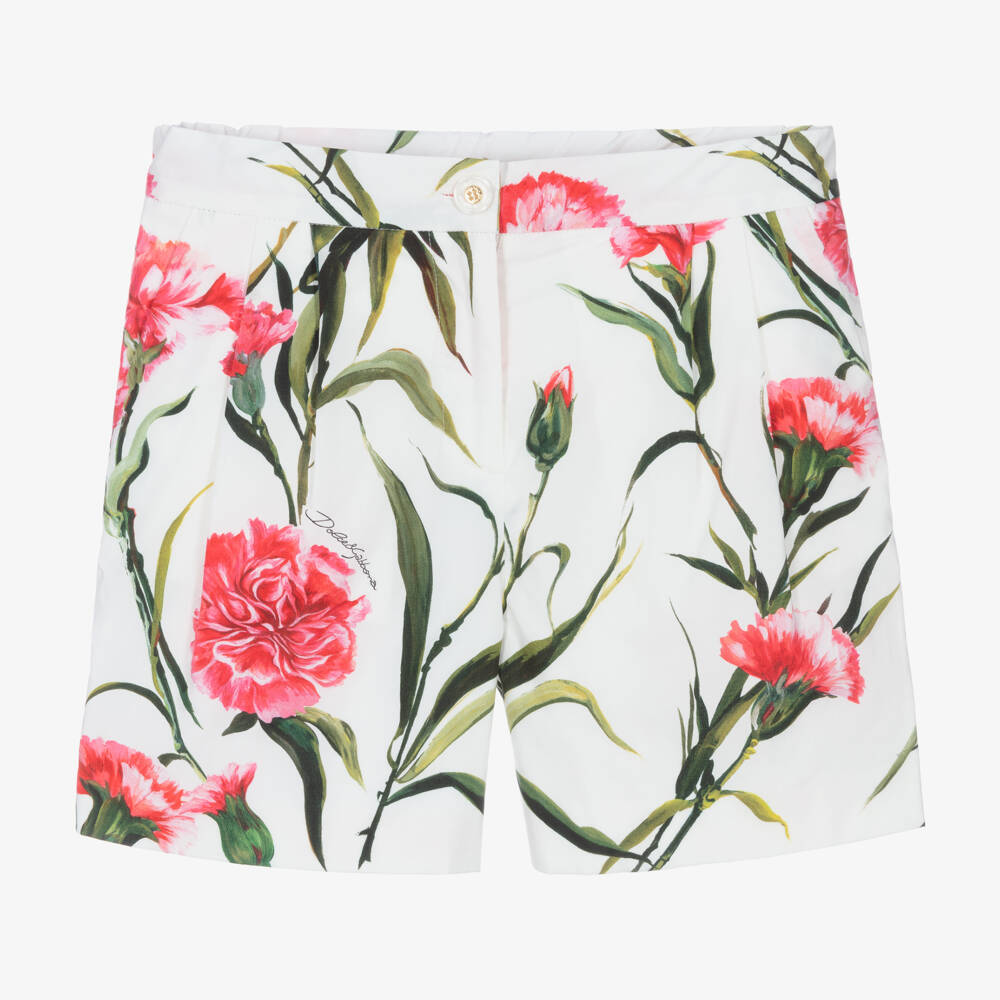 White cotton shorts for teen girls by Dolce & Gabbana, patterned with bold pink and green carnations and discreet black logo prints. Creating a fun and fresh silhouette, they are made in lightweight poplin, with slanted pockets and pleats on the front. Fully lined for comfort, the shorts fasten with a zip and pearlised button with a gold branded centre. This stylish design is inspired by the luxury Italian designer's main collection.