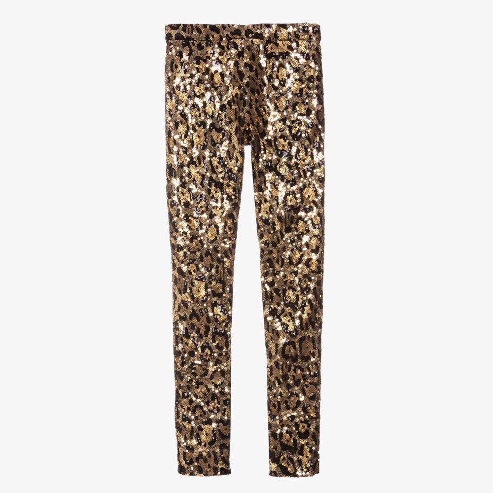 Teen girls special occasion leggings by luxury Italian brand, Dolce & Gabbana. Embellished with sequins in a gold and black leopard design, they are full length and have a side zip fastening, zips at the ankles, and a cotton jersey lining for comfort.