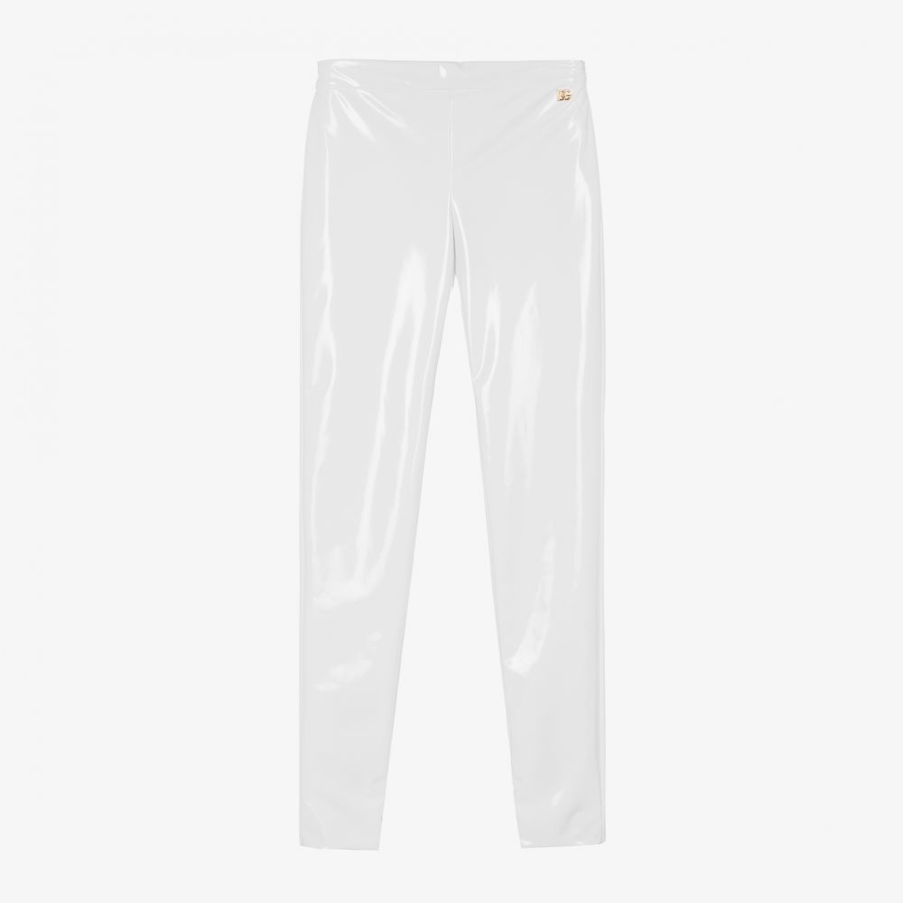 White vinyl leggings for teen girls by luxury Italian brand Dolce & Gabbana, with a gold DG charm on the hip. As seen in the main collection, they have a soft cotton jersey lining and concealed ankle zips. Soft and smooth, these flat fronted trousers have an adjustable waistband and fasten with a side zip.