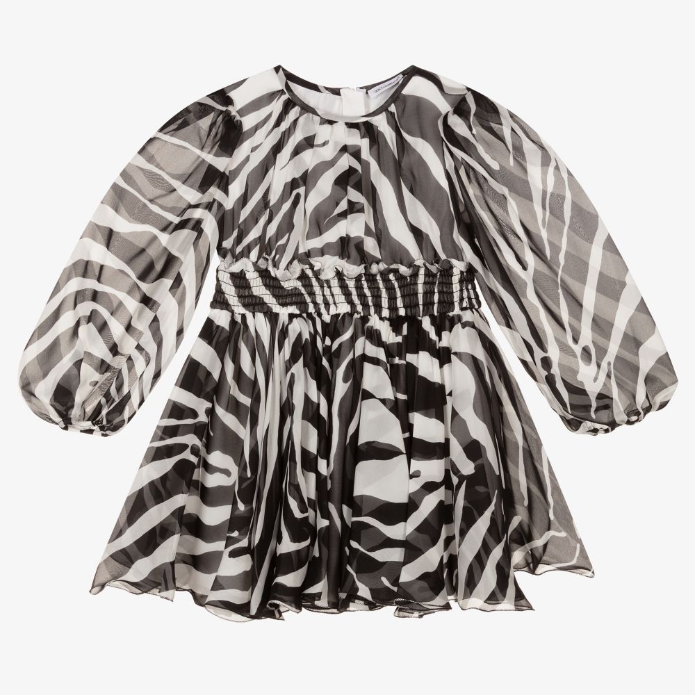 Black and white Mini-me dress for girls by luxury Italian designer Dolce & Gabbana, with a zebra print. Made in luxurious lightweight silk chiffon, it has gathers around the neckline, a frilled, ruched waistband and gently elasticated cuffs on the puffed sleeves. It fastens with a concealed zip around the back and is lined in soft ivory viscose satin.