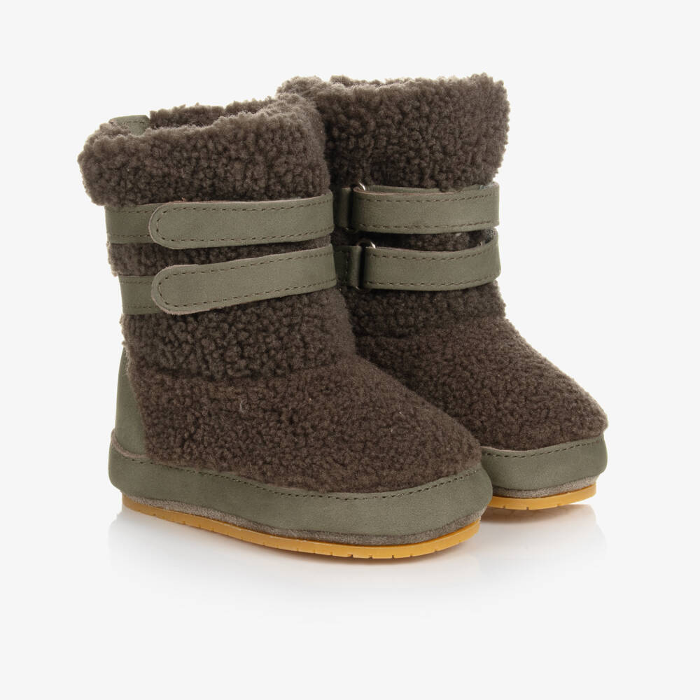 Khaki green pre-walker booties for baby boys by Donsje, handmade from the softest faux bouclé fur. Super soft and snuggly, these shoes have suede straps which fasten securely around the ankle and a warm faux fur lining for comfort. Smaller sizes have non-slip suede outsoles, while older sizes have flexible rubber outsoles.