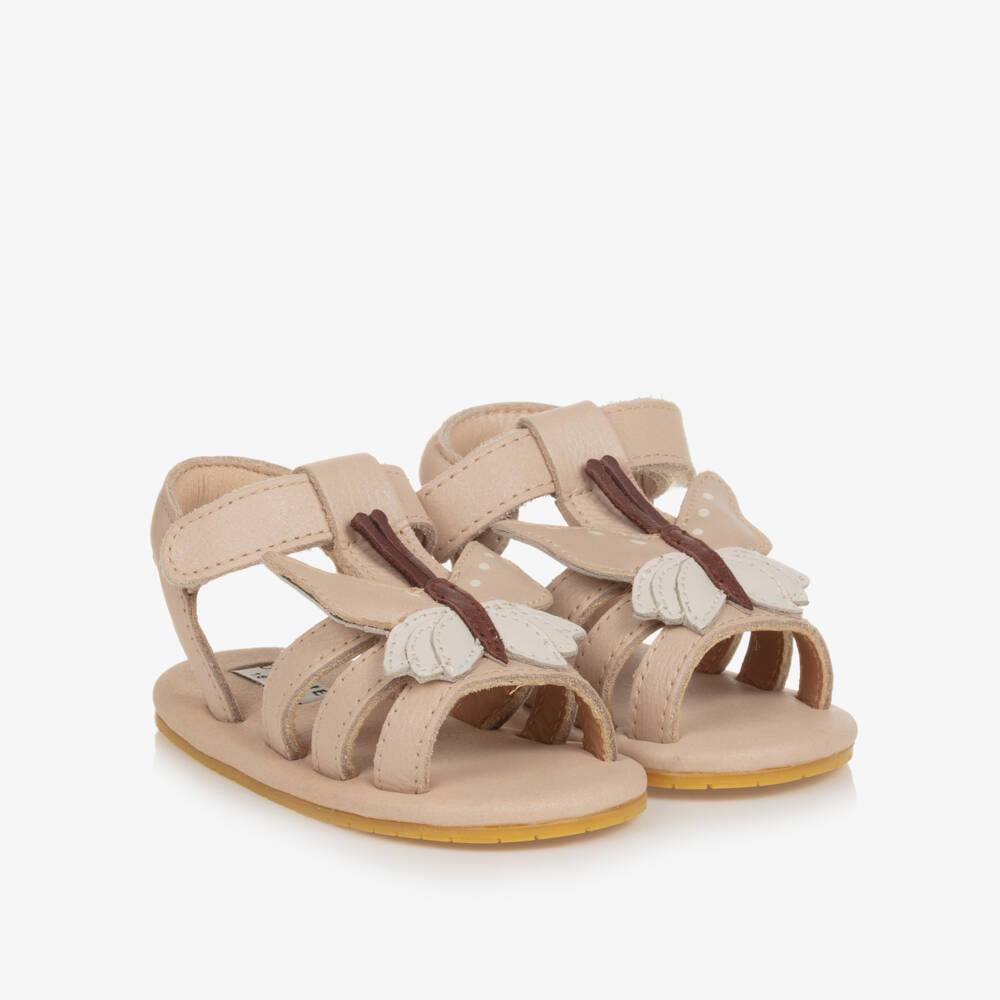 Baby girls pale powder pink pre-walker sandals by Donsje, decorated with sweet butterfly appliqués on the straps. Handmade in super soft nubuck leather, they are fully leather lined for comfort, with a lightly padded insole and ankle straps for extra support. Fastening with practical velcro straps, they have a suede leather outsole on smaller sizes and a flexible rubber sole on larger sizes, ideal for taking those first steps.