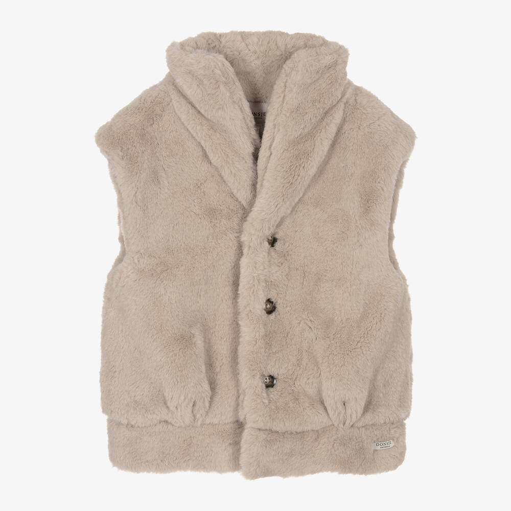 Beige faux fur gilet for boys and girls by Dutch brand, Donsje. Beautifully soft, it has a high collar for added cosiness. There is a beige satin lining and the gilet fastens with mock horn buttons. An embroidered logo tab on the front hem finishes the look with a designer touch.