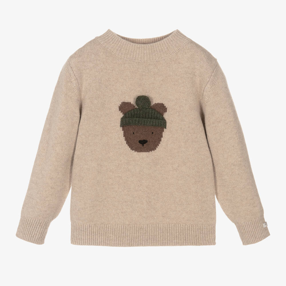 Cosy beige sweater for boys and girls by Dutch label, Donsje. Luxuriously knitted in Merino wool, this warm layering piece has an intarsia teddy bear on the front wearing a cute 3D bobble hat. The designer's logo is stitched on one cuff, signing off the look with a subtly branded touch.