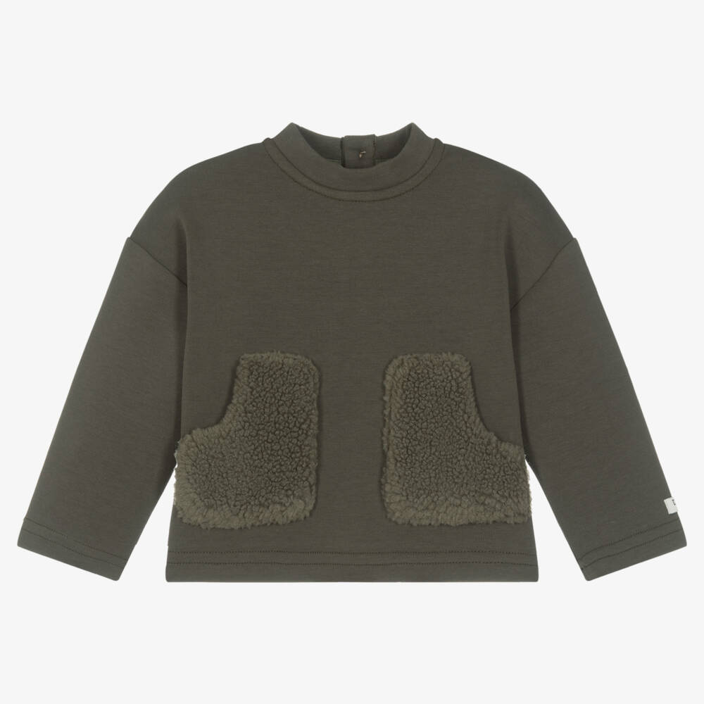 Khaki green sweatshirt for little boys by Dutch brand, Donsje. Made in soft cotton blend jersey, it has fleecy hand pockets on the front. It fastens simply with faux tortoise shell buttons on the back.
