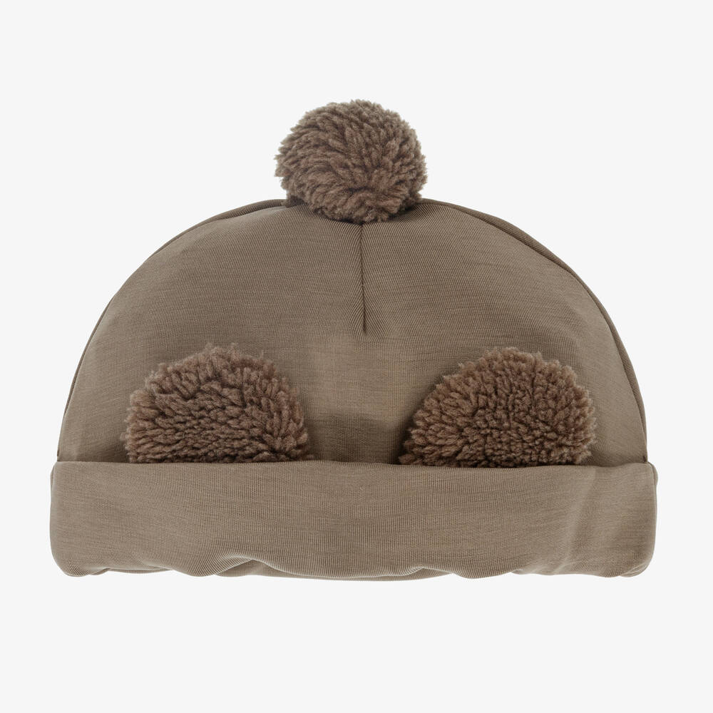 Cosy brown bear cub hat for little boys and girls by Donsje, made in luxuriously soft modal blend jersey. It has faux fur 3D ears on the front and a fluffy pom-pom on the top, adding a super adorable touch. The brand's signature badge is sewn on the back of the turned-up brim.