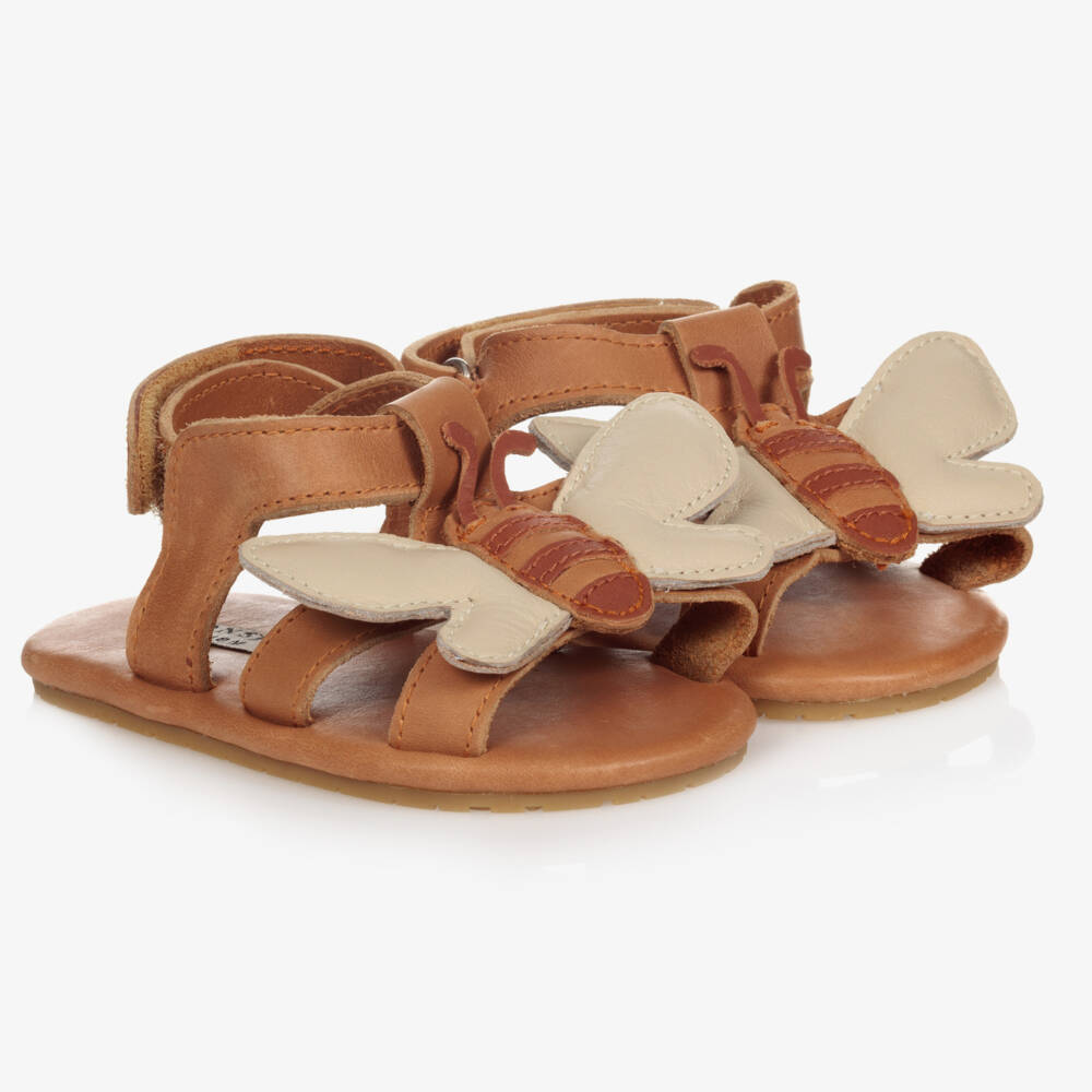 Baby girls tan brown sandals by Donsje, handmade in super soft leather. They are fully leather lined for comfort, with velcro fastening straps on the back and an adorable, padded honey bee design with ivory wings on the toes. They have a suede leather outer sole on smaller sizes and a flexible rubber sole on larger sizes, perfect for taking those first steps.