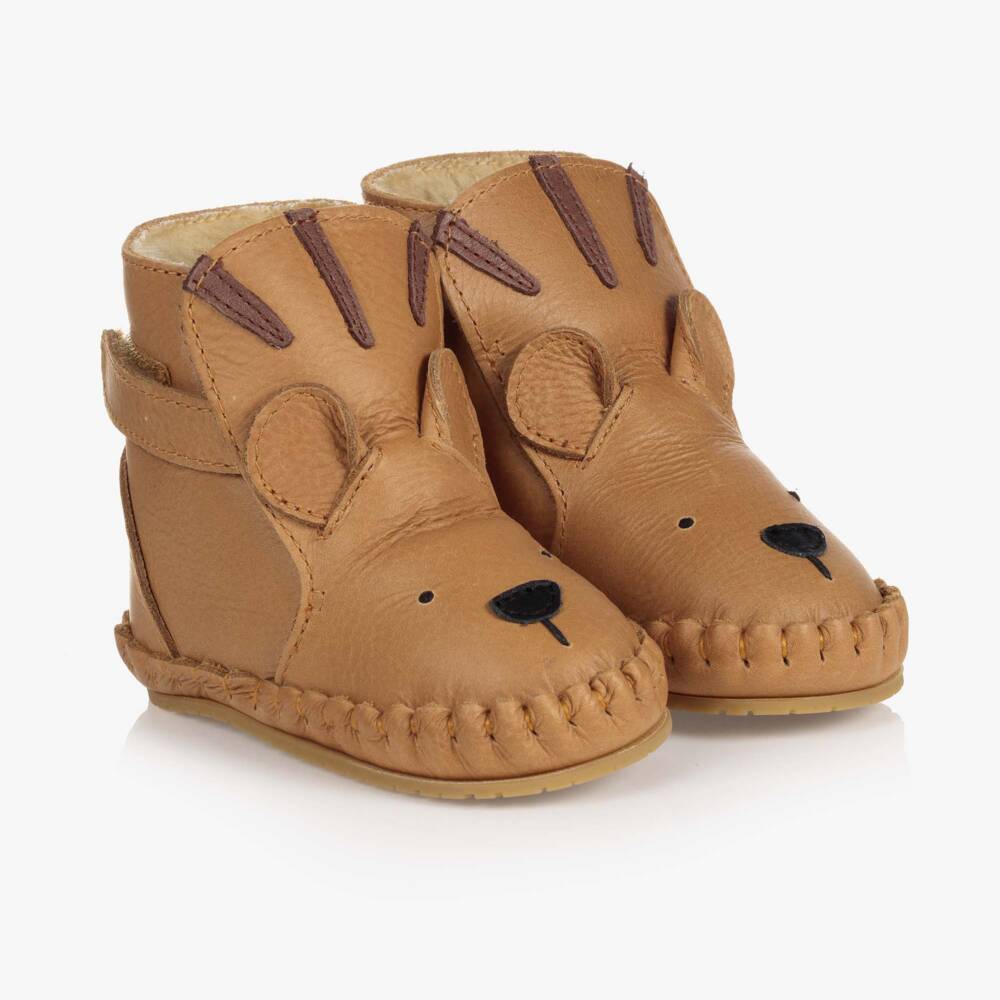 Adorable brown tiger shaped boots for baby boys from Donsje, with appliqué ears and stripes. Made in super soft leather and lined in faux fur, they fasten with a velcro strap for extra support. They have a suede leather outer sole on smaller sizes and a flexible rubber sole on larger sizes, perfect for taking those first steps.