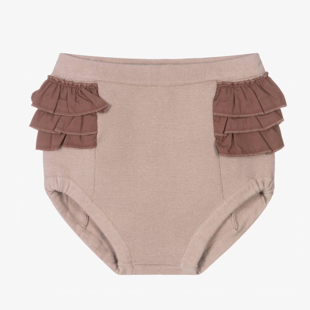 Handmade dusky pink frilly pants for little girls by Donsje, knitted in soft cotton. They have layered ruffles on the sides and are discreetly signed with the brand's logo patch on the back. The waist and leg openings are stretchy to allow for a comfortable fit and easy dressing.