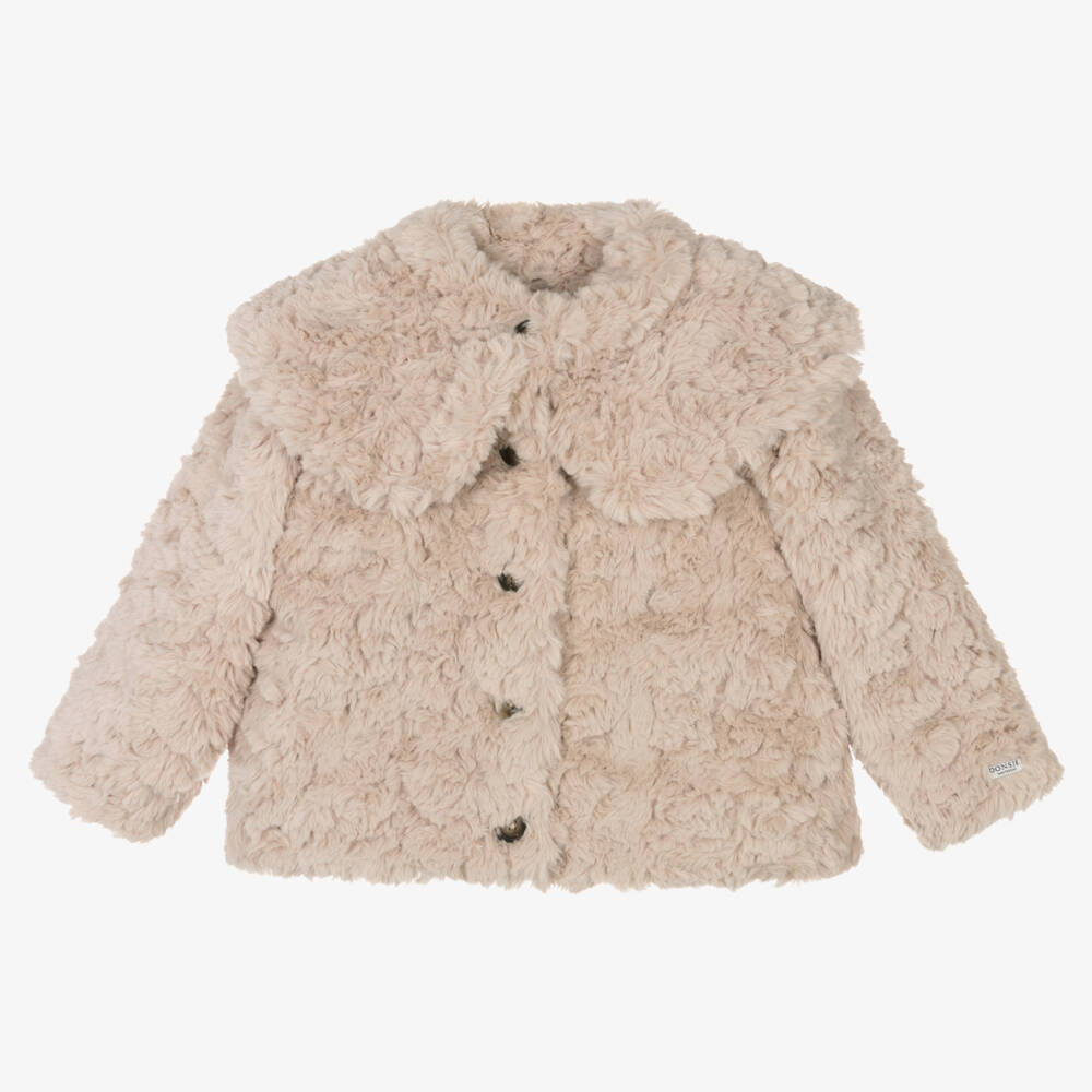 A gorgeously soft and cosy beige faux fur jacket for girls by Donsje. Lined in padded, breathable cotton, this jacket has a wide, statement collar and large tortoiseshell buttons that fasten on the front. There are discreet side seam pockets and a small logo tab on one cuff for a subtle designer touch.