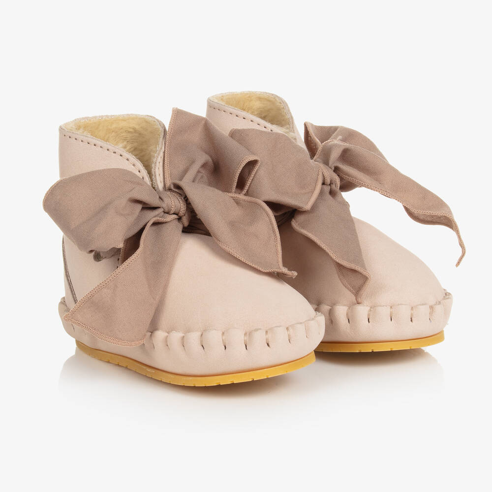 In a lovely shade of beige with a hint of pink, these sweet boots for baby girls are from Donsje. Handmade in soft premium leather, they are fully lined in soft faux fur for comfort. They fasten with a fabric ribbon bow, to allow for an adjustable, comfortable fit. Ideal for taking those first steps, larger sizes have flexible rubber soles, while the smaller sizes have a soft suede leather outer sole.