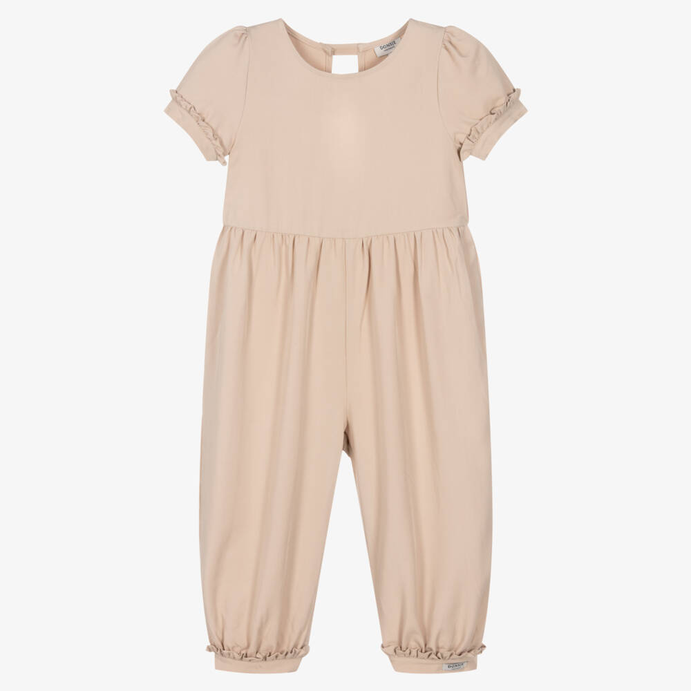 Beige jumpsuit for girls by Dutch brand Donsje, handmade in soft viscose and modal blend twill. Comfortable and stylish, it has puffed sleeves and cuffed ankles with ruffle trim and is designed with an open back and button tab fastening. The designer's embroidered logo tab can be found on one ankle for a discreet branded touch.