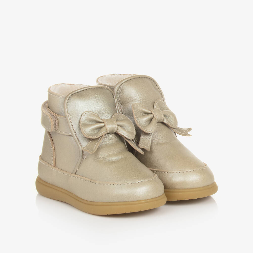 In a lovely shade of champagne gold, these first walker boots for baby girls are by Dutch brand Donsje. Handmade in soft and supple leather, these pretty shoes have a decorative bow on the front and an embossed logo on the back. For a secure fit, a velcro strap fastens around the back of the ankle. They are lined in soft and cosy faux fur and have a flexible, non-slip rubberised outer sole for good grip.