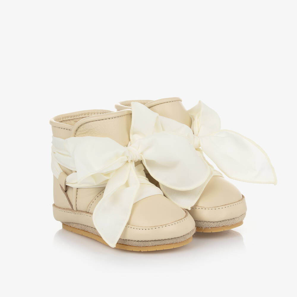 In a lovely dark ivory shade, these sweet pre-walker boots for baby girls are from Donsje. Handmade in soft premium leather, they are lined in soft faux fur for comfort and warmth. The wrap-around ribbons tie into a bow on the front for a comfortable fit on little feet. Ideal for taking those first steps, larger sizes have flexible rubber soles, while the smaller sizes have a soft suede leather outer sole.
