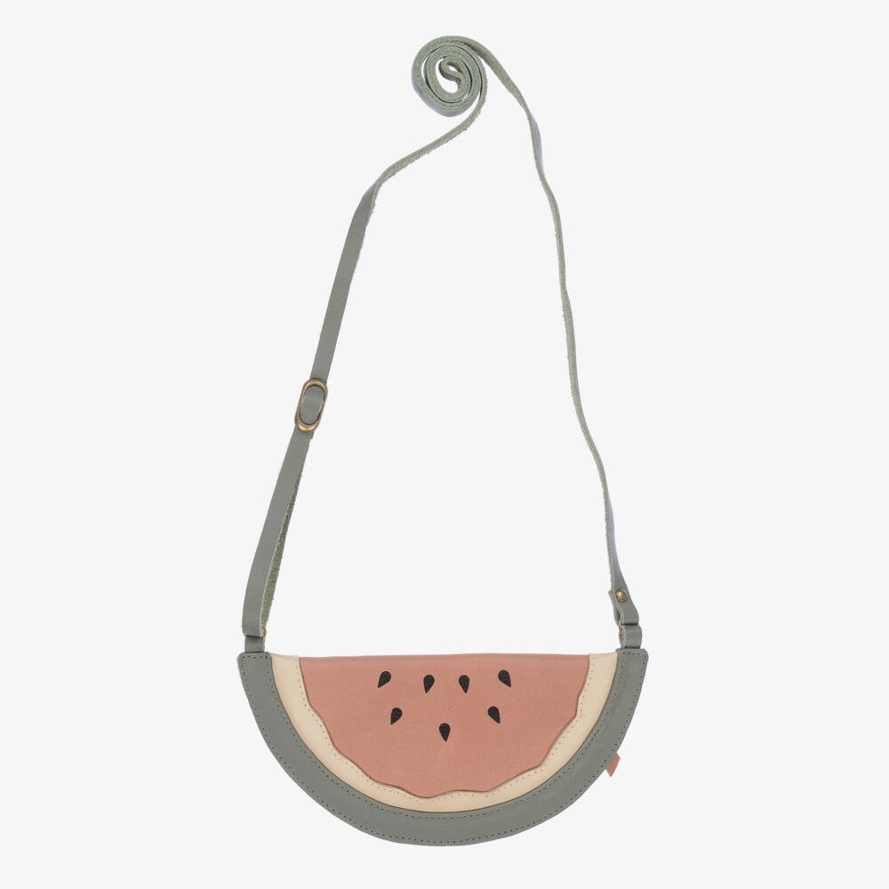 Girls lovely watermelon-shaped coin purse in green and pink, handmade in soft leather by Donsje. The small compartment secures with a zip fastening on the back for added security and the shoulder strap is adjustable for the right length.