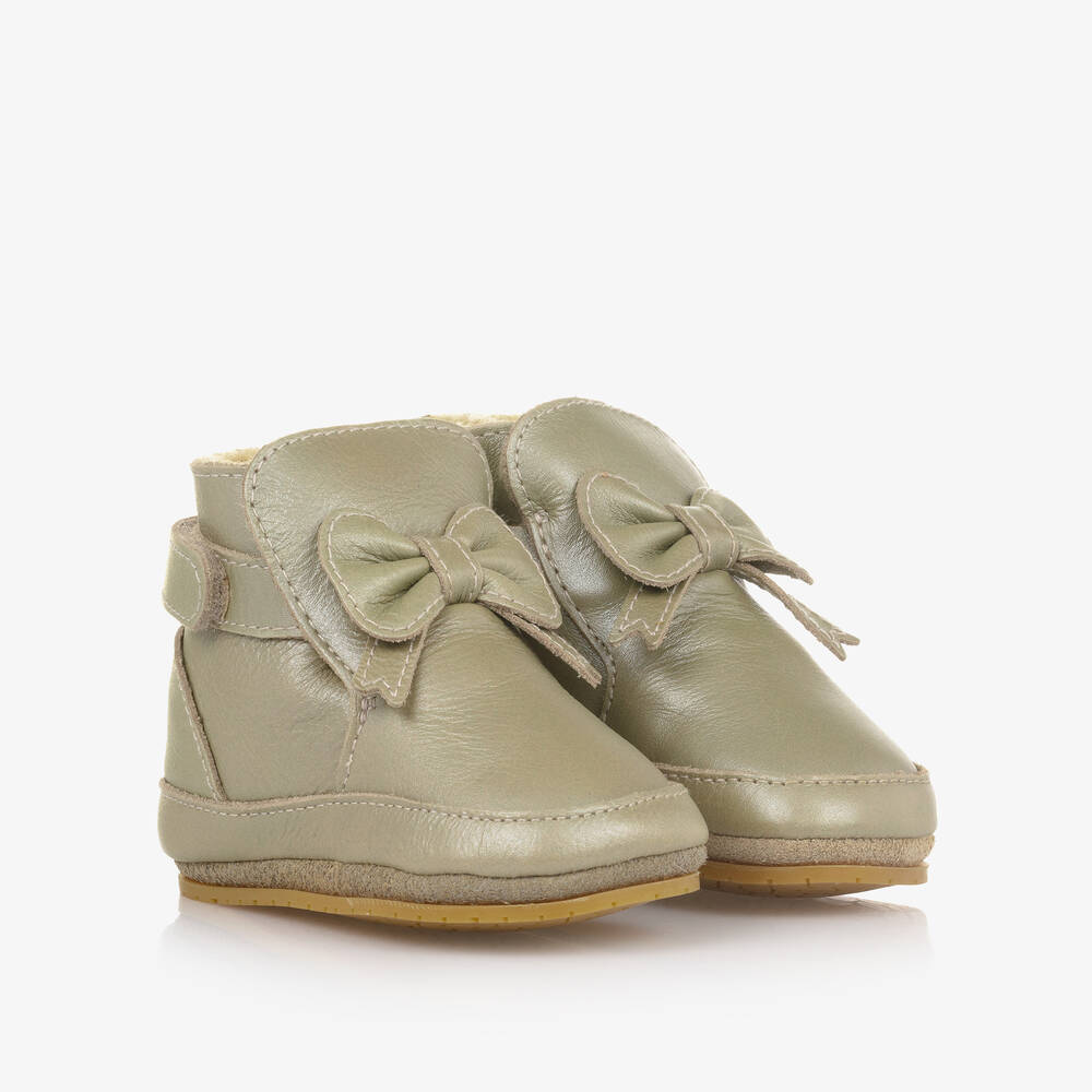 Lovely metallic green-gold pre-walker boots for baby girls from Dutch brand Donsje. Handmade in soft and supple leather, these cute shoes have pretty bow detailing on the front and a soft and cosy faux fur lining. There is an embossed logo on the back and for a secure fit, a velcro strap fastens around the back of the ankle. Ideal for taking those first steps, larger sizes have flexible rubber soles, while the smaller sizes have a soft suede leather outer sole.